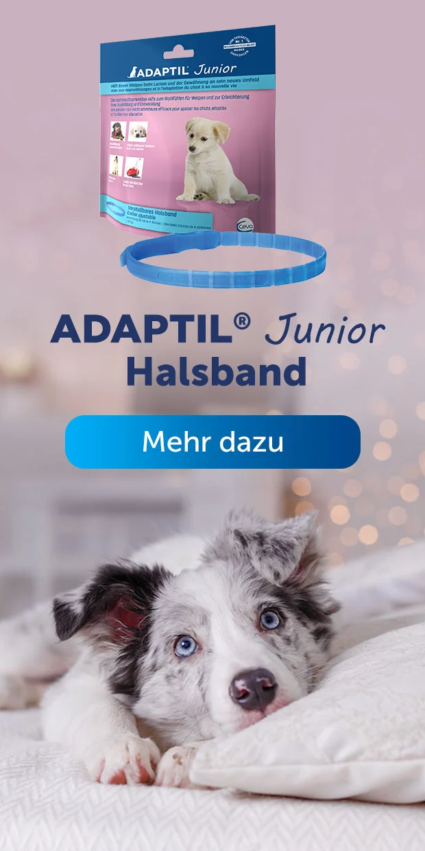 Beim Durchschlafen unterstützt euch auch ADAPTIL Junior. Das Halsband vermittelt Ihrem Welpen ein Gefühl von Sicherheit und Geborgenheit, das jenem ähnelt, das er bei seiner Mutter empfunden hat.